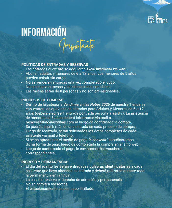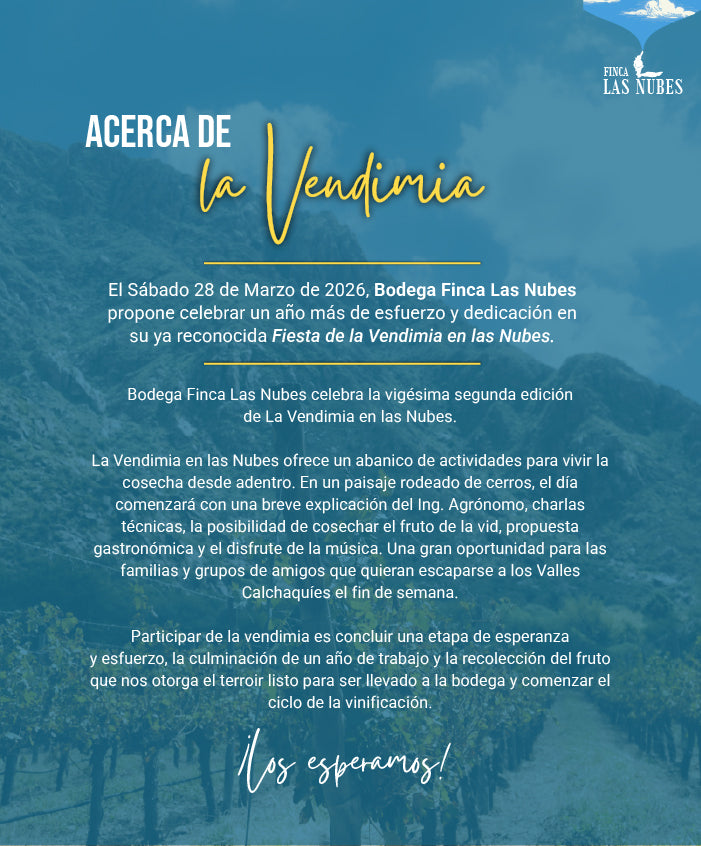 El Sábado 28 de Marzo de 2026, Bodega Finca Las Nubes propone celebrar un año más de esfuerzo y dedicación en su ya reconocida Fiesta de la Vendimia en las Nubes.
